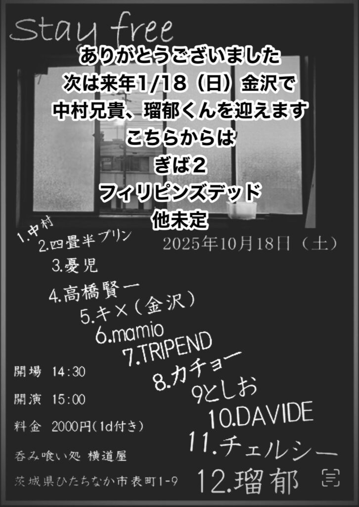 2025年10月18日の横道屋さんでのライブ「Stay free」は本当に人に触れたようなライブでした。